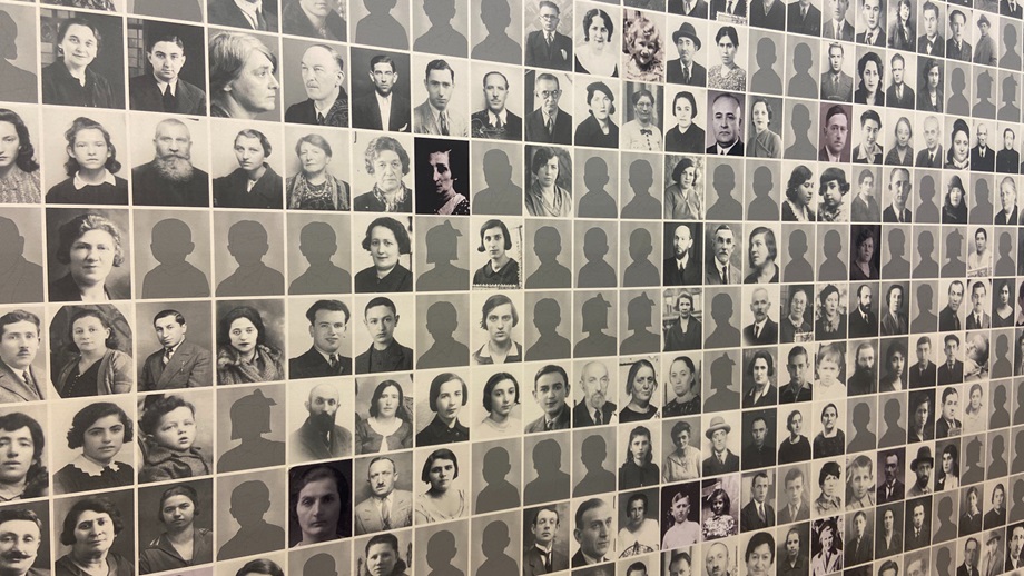 Meteen valt de enorme fotowand op, vier verdiepingen hoog, gevuld met kleine portretten van mensen die vanuit Dossin zijn gedeporteerd. De zwartwitoto’s tonen mensen die het niet hebben overleefd, wie het wel overleefde is in sepia afgebeeld. De militanten worden helemaal stil bij het zien van zoveel zwart-witfoto’s, van slachtoffers die allemaal een gezicht krijgen.