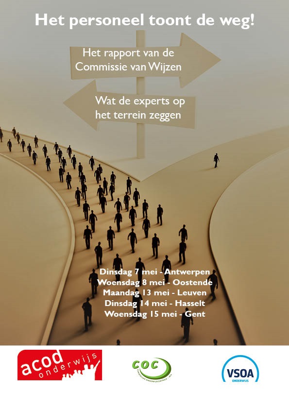 COC komt samen met ACOD Onderwijs en VSOA Onderwijs op straat tegen een aantal verbijsterende voorstellen uit het rapport van de Commissie van Wijzen. Op 7 mei voeren ze actie in Antwerpen, op 8 mei in Oostende, op 13 mei in Leuven, op 14 mei in Hasselt en op 15 mei in Gent.